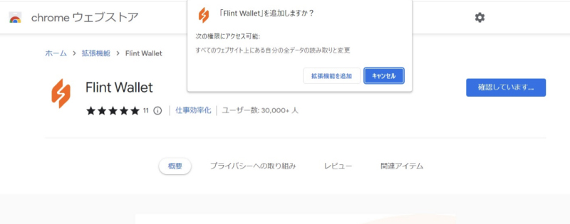 以下は、拡張機能から起動しています。Chromeに追加をクリックすると、確認していますが出ます。別枠でFlint Walletを追加するか聞かれるので、拡張機能を追加をクリックします。