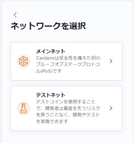 起動したら開始するをクリックすると初期設定として、言語の選択、プライバシーポリシーへの同意があります。次にネットワークの選択ではメインネットを選択してください。