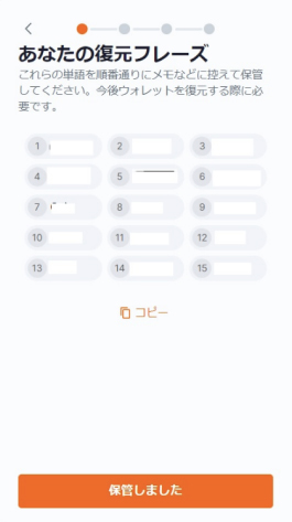 その後、復元フレーズと呼ばれる英単語15個で構成されるフレーズ群が表示されますので、これを紙などで書き留めてください。