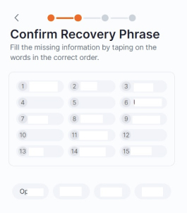 復元フレーズを書き留めた後に、次の段階へ進むと、先ほど書き留めた復元フレーズの一部が空欄表示されますので、その部分に下の選択肢の中から正しいフレーズをクリックし、復元フレーズを完成させてください。