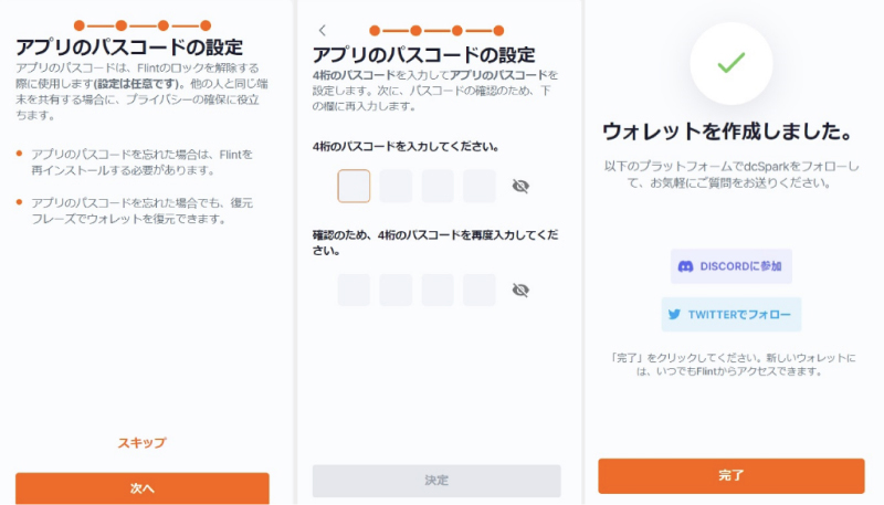 この送金パスワードは、インストールされたFlint Walletの中身が変動するような操作の際に必要となります。ただし、パスワードを忘れた場合でも、先ほどのウォレット作成手順において、一番下にある「秘密の復元フレーズから復元する」を選んで、復元フレーズを入力することによって、再度NFTやトークンの操作が可能となります。