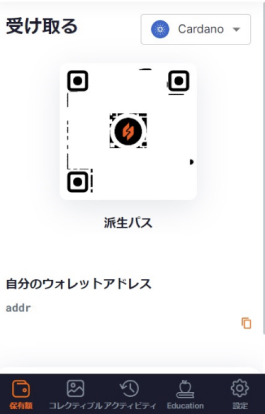 Flint Walletのインストールが終わったら、次は、購入に必要なADAをFlint Walletに送金します。すでに、YoroiウォレットやDaedalausウォレットなどにおいてADAをお持ちの方や、暗号資産取引所においてADAをお持ちの方は「受け取る」をクリックすると表示される受信アドレスをコピー、もしくは、QRコードの読み取りを行ってください。