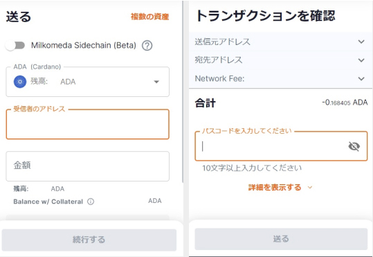 まず、受け取る(Receive)をクリックした後に表示されるご自身のアドレスをクリックします。その後に、送る(Send)をクリックして宛先アドレスにご自身のアドレスをペーストします。その後、5ADA-10ADAの範囲の量を指定して、続行するを押したのちに、送金パスワードを入力してください。