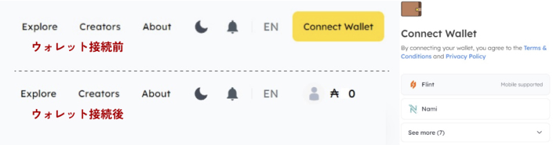 欲しい商品が決まりましたら、画面右上の黄色いボタンのところを確認してください。Wallet Connectと表示されている場合、ボタンをクリックした後にインストールしてあるWallet(本説明に従った方はFlint)をクリックしてください。しばらくすると、ADAの残高が表示されるようになります。