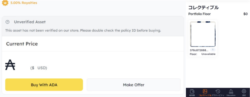 ADA残高が表示されている方は、購入したい製品を選択して、Buy with ADA(ADAで購入)をクリックします。そうするとFlint Walletが立ち上がりますので、支払うADAに間違いがないことを確認して、送金パスワードを入力してください。しばらくしますと購入したNFTがFlint Walletに届きます。Flint Walletのコレクティブルをクリックすると、購入したNFTが確認できます。